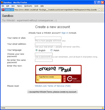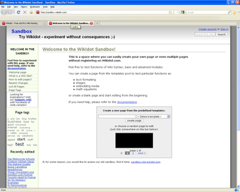 Una vez registrado, puedes empezar a construir tu wiki. Hay dos opciones, utilizar un dominio propio o bien almacenar la web en Wikidot. Si prefieres comprobar antes su funcionamiento, Wikidot cuenta con una "sandbox" en la que puedes ver si es el tipo de servicio que buscas.